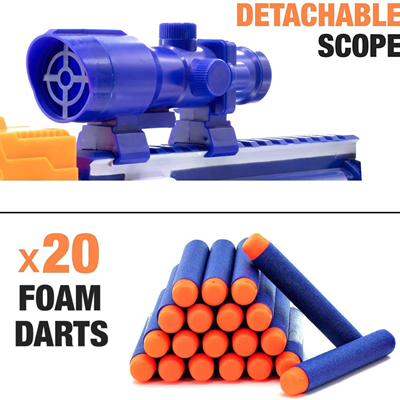 بازی کردن با تفنگ اسباب بازی به عنوان اسباب بازی پسرانه می تواند ارمغان آورنده ی هیجان بسیار زیادی برای کودکان و نوجوانان باشد. آن ها می توانند برای این بازی به دنیای خیالی شان بروند. و در نبردی جذاب و نفس گیر یک دنیا سرگرمی را برای خود به ارمغان آورند. این گونه بازی ها عموما با تعقیب و گریز های کودکانه همراه است و این امر می تواند کودک را به لحاظ فکری و بدنی درگیر کند از آنجایی که پسر بچه ها عاشق اسلحه و بازی های هیجانی هستند, این اسلحه جالب و زیبا می تواند باعث لذت و سرگرمی کودک شود.سرعت و قدرت پرتاب آن لذت بسیاری را به کسانی که از آن استفاده می کنند می دهد به گونه ای که شما در هر سنی که باشید می توانید از بازی کردن با این اسباب بازی لذت ببرید.