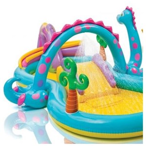 استخر بادی سرسره دار یا پارک بادی طرح اژدها یکی دیگر از پر طرفدار ترین محصولات بادی اینتکس می باشد که با کد 57135 در میان محصولات اینتکس معرفی می شود. پارک بادی اژدها در میان پارک های بادی اینتکس از تنوع طرح و رنگ بالایی به نسبت به بقیه پارک های بادی برخوردار است.از متعلقات پارک بادی اژدها می توان به داشتن سرسره، آبنما یا فواره، یک عدد اژدها و 2 عدد حلقه بادی و 6عدد توپ رنگی اشاره کرد.جنس بدنه پارک بادی اژدها ساخته شده از ونیل با ضخامت نسبتا زیاد می باشد و سازگار با پوست بدن بوده و هیچگونه حساسیتی را برای فرزند شما ایجاد نخواهد کرد.پارک بادی اژدها با 3 متر طول بزرگترین پارک بادی اینتکس محسوب می شود. در قسمت تاج پارک بادی اژدها یک فواره تعبیه شده که آب را با زیبایی و ظرافت خاصی به درون استخر سرازیر می نماید. جهت فعالسازی این فواره کافیست اتصال آن را به شیلنگ آب متصل کرده و فشار آب را تنظیم نمایید. بدیهی است در صورتیکه فشار آب بیشتر از حد استاندارد باشد، می تواند به اتصالات فواره آسیب وارد نماید. درون بسته بندی این محصول یک برچسب تعمیرات وجود دارد که در صورتی که محصول دچار آسیب شد می توان از آن برای تعمیرات موقت استفاده کرد. جهت حفظ ایمنی و افزایش طول عمر محصول رعایت 2 نکته الزامی می باشد. نکته اول اینکه حتما جهت استفاده از محصول برای سطح زیر آن از یک زیر انداز و یا کف پوش مناسب استفاده نمایید تا از آسیب دیدن محصول پیشگیری نمایید. نکته دوم حجم باد محصول است که برای باد کردن آن حتما از پمپ باد های شرکت اینتکس استفاده نمایید. پیشنهاد می شود هیچگاه از کمپرسورهای باد غیر استاندارد (بعلت فشار باد زیاد) برای باد کردن این محصولات استفاده نکنید زیرا می تواند آسیب جدی به محصولات وارد نماید.