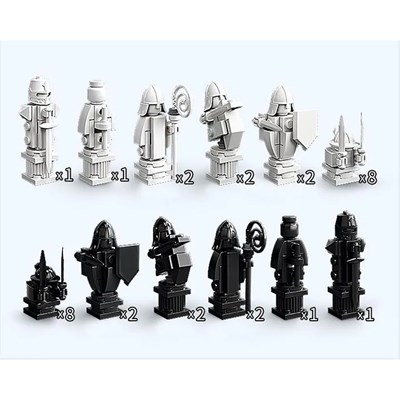 - دارای 32 لگوی مهره ی شطرنج (16 مهره سفید و 16 مهره سیاه)