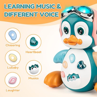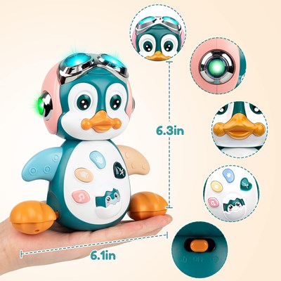 اسباب‌ بازی موزیکال پنگوئن با طراحی بامزه و نورهای LED رنگارنگ، لحظاتی شاد و سرگرم‌کننده را برای کودک فراهم می‌کند. این اسباب‌بازی دارای ۵ دکمه با صداهای متنوع مانند لالایی، خنده و صدای حیوانات است و دکمه قلبی آن با پخش صدای ضربان قلب، موجب آرامش نوزاد می‌شود. برای عملکرد نیاز به ۳ عدد باتری قلمی دارد (در جعبه موجود نیست) و از پلاستیک مقاوم و باکیفیت ساخته شده است. مناسب برای کودکان بالای ۱۸ ماه می‌باشد.