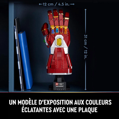لگو دستکش آیرون من 675 قطعه محصولی فوق العاده با کیفیت ساخته شده از روی فیلم اونجرز سری پایان بازی ساخته شده است. این محصول مخصوص طرفداران کتاب های کمیک و دنیای مارول می باشد.این دستکش که انگشتانش قابلیت حرکت دارند بر روی پایه ای قرار دارد پس از ساخت به ارتفاع 31 سانتی متر می رسد. دستکش آیرون من هدیه ای مناسب برای کلکسیون داران و یا کسانی که طرفدار آیرون من هستند می باشد. سنگ های ابدیت این محصول که هر یک در فیلم نماد عنصر و یا قدرتی بودند به شکل رنگی بر روی دستکش قرار دارند.