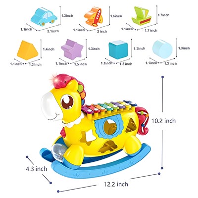 • محتویات شامل: راکر اسب تعادلی بلزدار، 3 برگه نت، 7 مکعب اشکال، 1 مضراب