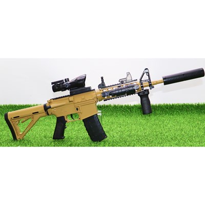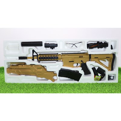- دارای : 5 بسته تیر ژلهای (500 عدد هر بسته)، بند کمری، خشاب قابل پر کردن، یدک (دستی) بغل اسلحه، دوربین قابل نصب