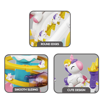 این اسباببازی جذاب با طراحی خلاقانه و ویژگیهای سرگرمکننده خود، دنیایی از هیجان و شادی را برای کودکان به ارمغان میآورد. مجموعه شامل پله برقی موزیکال و چراغدار و یک چرخ و فلک نورانی با قابلیت چرخش است که به کمک اسب های تک شاخ کوچک، بازی را برای کودک شما به تجربهای پویا و مهیج تبدیل میکند. اسب های تک شاخ از پلههای متحرک بالا میروند و سپس از سرسره سر میخورند، در حالیکه چراغهای رنگی و موسیقی شاد، فضایی پرانرژی ایجاد میکنند.