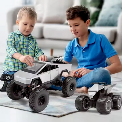 ماشین کنترلی بزرگ تسلا MZ یک غول چهارچرخ واقعی است! دو موتور براش وظیفه حرکت این ماشین کنترلی بزرگ را به عهده دارند و برای چرخش چرخهای جلو نیز از یک موتور براش دیگر که به کمک گیربکس چرخیدن چرخها را آسان میکند استفاده شده است . این ماشین کنترلی با داشتن لاستیکهای لاستیکی با چسبندگی بالا و سیستم چهار چرخ متحرک (4WD)، قادر به عبور از شیبهای 45 درجه و حرکت در سطوح مختلف مانند چمن، شن، گل و مسیرهای سنگی است. این ماشین کنترلی مجهز به چراغهای LED جلویی است که علاوه بر افزایش جذابیت ظاهری، تجربه رانندگی واقعیتری را برای کودکان فراهم میکند.در قسمت بار این ماشین،یک موتور کوچک هم قرار گرفته که قابلیت حرکت کردن با دست دارد و باعث جذابیت بیشتر این ماشین شده است.
