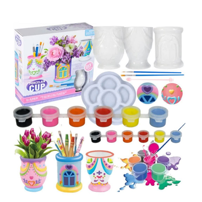 این مجموعه کامل 9 قطعه‌ای، فرصتی عالی برای خلق یک اثر هنری ماندگار فراهم می‌کند. سه گلدان چینی خام (ابعاد 10*7 سانتی‌متر) را با رنگ‌های دلخواه خود تزئین کرده و دکوراسیونی منحصر به فرد بسازید.محتویات این جعبه شامل 3 عدد گلدان چینی خام و آماده‌ی رنگ‌آمیزی ، 12 عدد گواش در 6 رنگ اصلی (قرمز، آبی، سبز، سفید، زرد و مشکی) و 2 قلموی حرفه‌ای (سرگرد و سرتخت)، 1 پالت رنگ و 1 قاشقک ترکیب رنگ می باشد. این سرگرمی و فعالیت هنری برای کودکان بالای 3 سال مناسب بوده همچنین گلدان‌ها پس از رنگ‌آمیزی نهایی، قابلیت شستشو یا رنگ‌آمیزی مجدد ندارند.