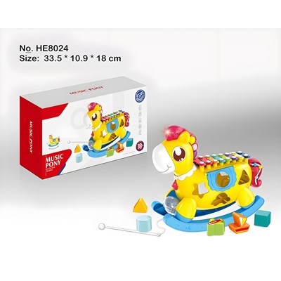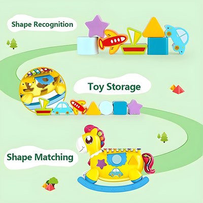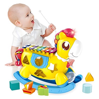 • محتویات شامل: راکر اسب تعادلی بلزدار، 3 برگه نت، 7 مکعب اشکال، 1 مضراب
